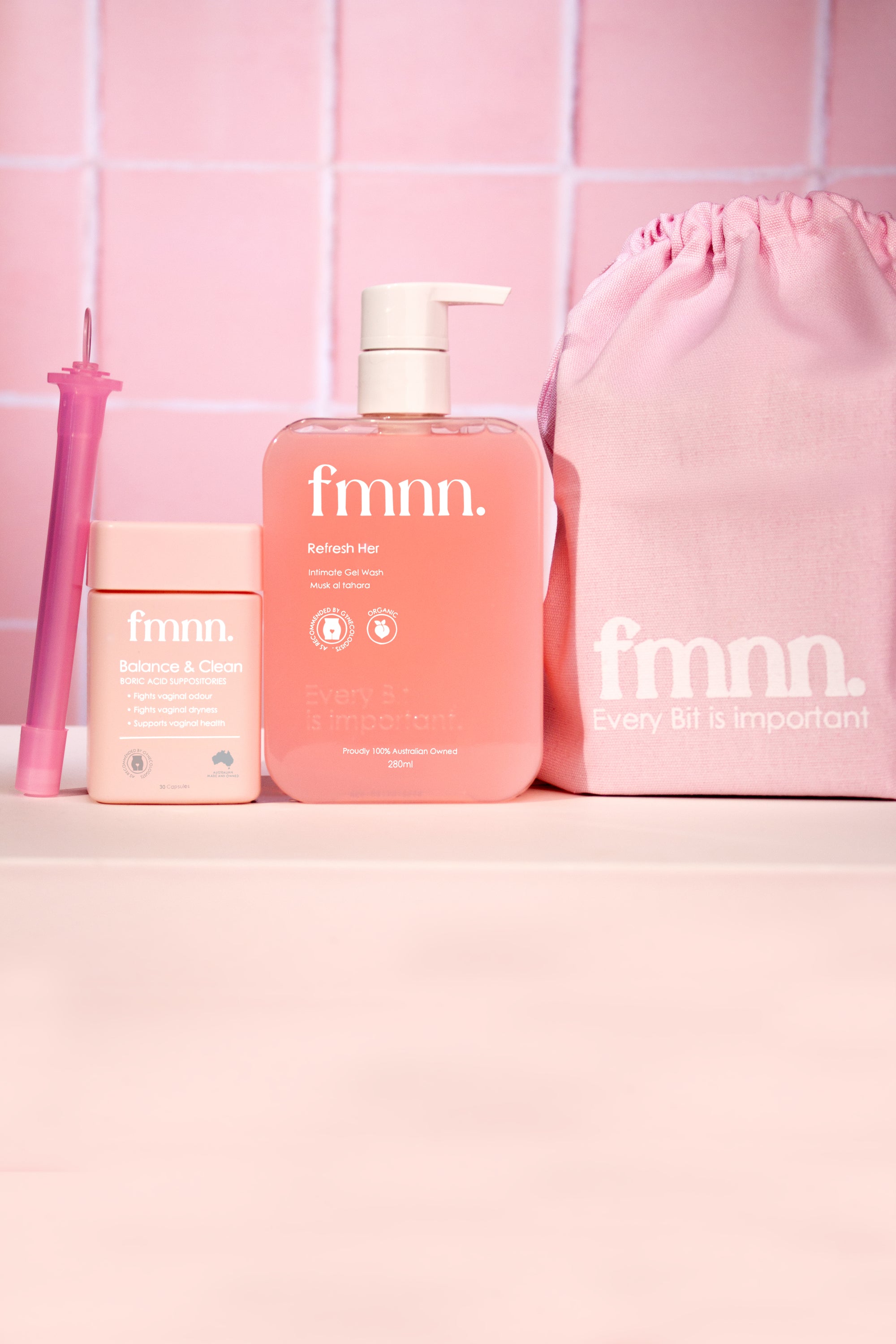 افتح حزمة FMNN للعناية الكاملة التي تحتوي على كل من FMNN Balance & Clean Boric Acid Pops وغسول FMNN Refresh Her Intimate Peach Gel ، بالإضافة إلى أداة توزيع حبوب FMNN المجانية.